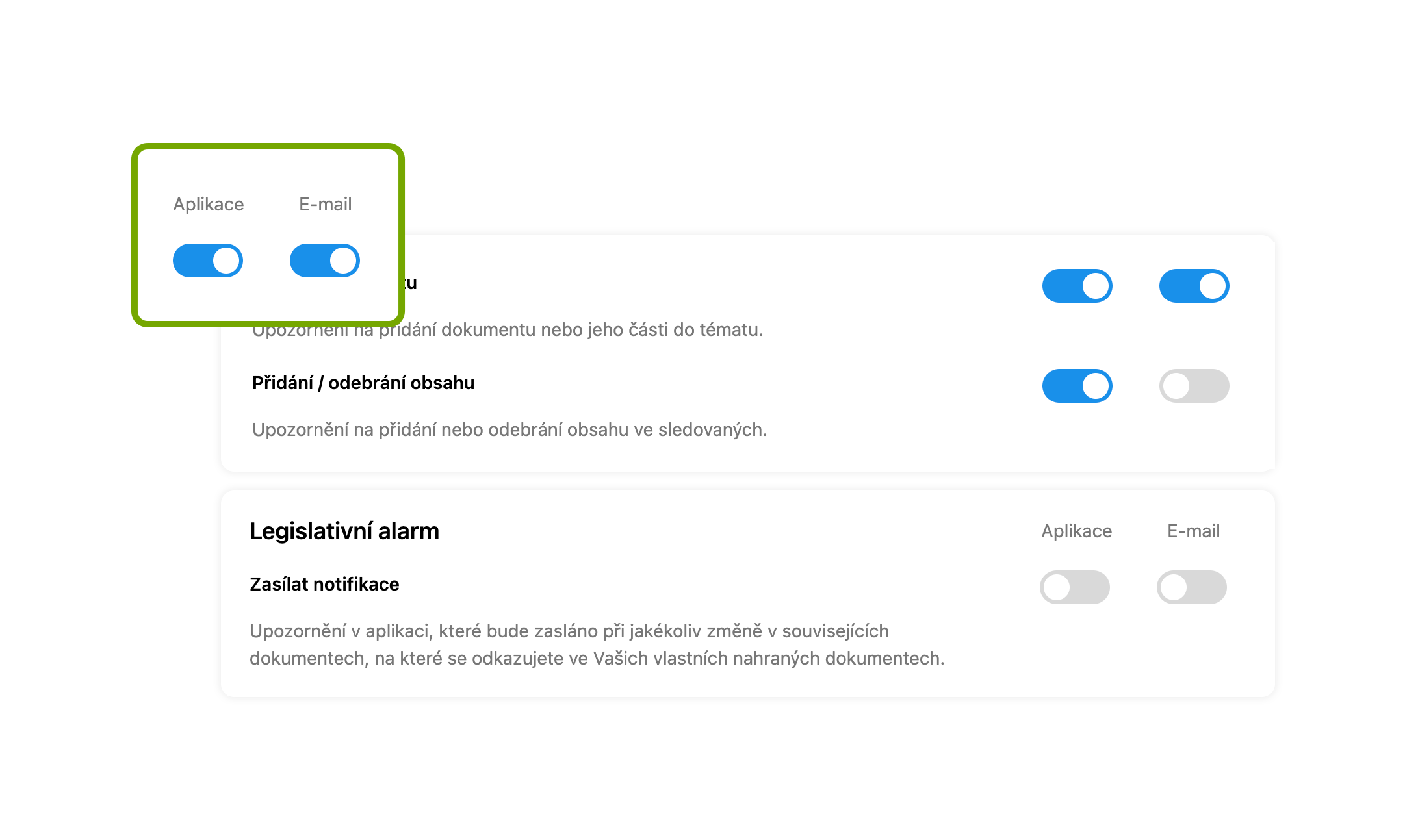 Druhým typem je nastavení notifikace v rámci Legislativního alarmu.
